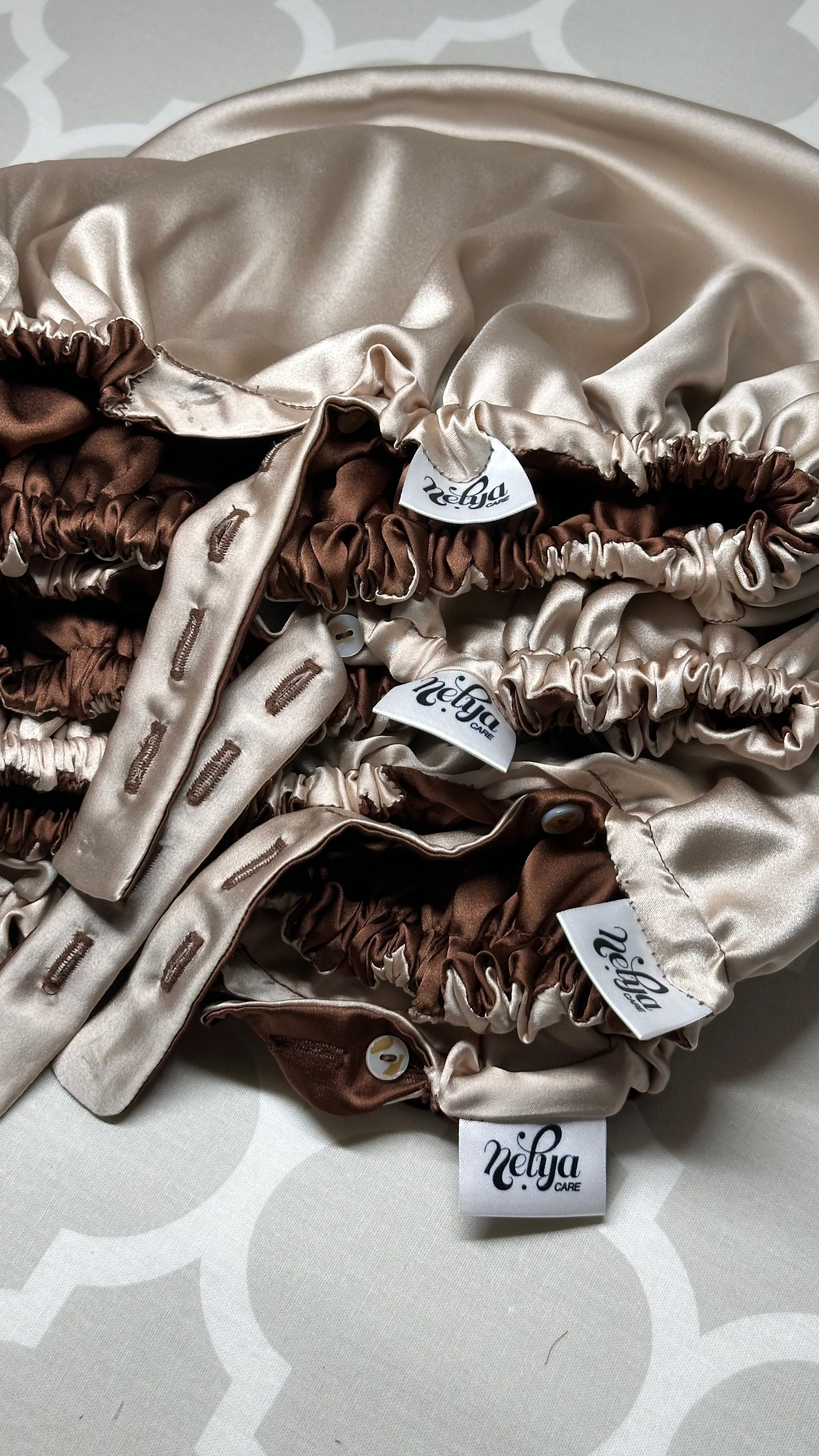 Les bonnets en satin de soie réversibles Nelya Care allient soin, confort et élégance pour sublimer vos nuits en toute simplicité.